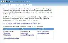 The security tab is used to create users and roles, group users under different roles and assign access rules either at the role-level or user-level.[5][6][7][8] When the Web site administration tool is opened to modify the existing settings, a new database is created in the App_Data folder of the application.[5] This database stores ASP.NET membership-related information. The name of the database created is ASPNETDB by default.[5]