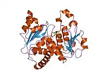 Aspartate carbamoyltransferase (ATCase) catalyses the conversion of aspartate and carbamoyl phosphate to carbamoylaspartate, the second step in the de novo biosynthesis of pyrimidine nucleotides.[4] In prokaryotes ATCase consists of two subunits: a catalytic chain (gene pyrB) and a regulatory chain (gene pyrI), while in eukaryotes it is a domain in a multi- functional enzyme (called URA2 in yeast, rudimentary in Drosophila, and CAD in mammals) that also catalyzes other steps of the biosynthesis of pyrimidines.[5]