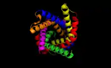 ANT has long been thought to function as a homodimer, but this concept was challenged by the projection structure of the yeast Aac3p solved by electron crystallography, which showed that the protein was three-fold symmetric and monomeric, with the translocation pathway for the substrate through the centre.[7] The atomic structure of the bovine ANT confirmed this notion, and provided the first structural fold of a mitochondrial carrier.[8] Further work has demonstrated that ANT is a monomer in detergents [9] and functions as a monomer in mitochondrial membranes.[10][11]
