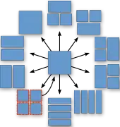 "T-shaped" partitioning patterns are introduced, a feature developed for VP10, as well as horizontal or vertical splits into four stripes of 4:1 and 1:4 aspect ratio. The available partitioning patterns vary according to the block size, both 128×128 and 8×8 blocks can't use 4:1 and 1:4 splits. Moreover, 8×8 blocks can't use "T" shaped splits.
