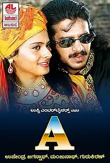 A is an 1998 Indian Kannada-language romantic psychological thriller film written and directed by Upendra. It stars Upendra and Chandini in the lead roles.[2] The film revolves around a love story between a film director and an actress which is narrated through multiple flashbacks within flashbacks and reverse screenplay. It also explores about the dark truths like casting couch in the film industry. The soundtrack and background score were handled by Gurukiran in his debut film.[3]