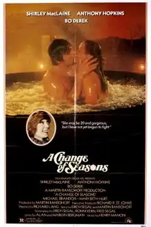 A Change of Seasons is a 1980 American comedy-drama film directed by Richard Lang. It stars Anthony Hopkins, Shirley MacLaine and Bo Derek. The film was a critical and commercial failure, grossing $7.2 million against its $6 million budget and receiving three nominations at the 1st Golden Raspberry Awards including Worst Actor (Hopkins) and Worst Screenplay.