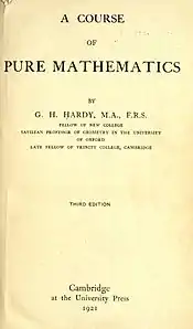 A Course of Pure Mathematics is a classic textbook in introductory mathematical analysis, written by G. H. Hardy. It is recommended for people studying calculus. First published in 1908, it went through ten editions (up to 1952) and several reprints. It is now out of copyright in UK and is downloadable from various internet web sites. It remains one of the most popular books on pure mathematics.