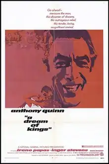 A Dream of Kings is a 1969 drama film directed by Daniel Mann and written by Ian McLellan Hunter, adapted from the novel of the same name by Harry Mark Petrakis.[2] The film stars Anthony Quinn, Irene Papas, Sam Levene and Inger Stevens in her final role, as she committed suicide two months after the film's release. Critics raved over Quinn's performance and those of the supporting cast.[3]