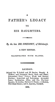 - Gregory, John (1808-01-01). A father's legacy to his daughters. London : Printed for T. Cadell and W. Davies.