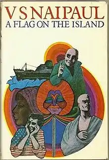 In late 1964 Naipaul was asked to write an original script for an American film.[1] He spent the next few months in Trinidad and Tobago writing a novella, "A Flag on the Island". The finished version was not to the director's liking and the film was never made.[1] The novella is set in 1964 in a Caribbean island that is not named.[2] The main character is an American named "Frankie" who affects the mannerisms of Frank Sinatra.[1] Frankie has links to the island from having served there during World War II.[3] He revisits reluctantly when his ship anchors there during a hurricane.[3] Naipaul wilfully makes the pace of the book feverish, the narrative haphazard, the characters loud, the protagonist fickle or deceptive, and the dialogue confusing.[3][1] Balancing the present time is Frankie's less disordered, though comfortless, memory of 20 years before.[4] Then he had become a part of a community on the island.[4] He had tried to help his poor friends by giving away the ample U.S. Army supplies he had.[4] Not everyone was happy about receiving help and not everyone benefited.[4] Frankie was left chastened about finding tidy solutions to the island's social problems.[4] This theme, indirectly developed in the story, is one to which Naipaul would return.