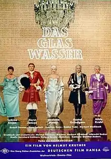 A Glass of Water (German: Das Glas Wasser) is a 1960 West German comedy-musical film directed by Helmut Käutner and starring Gustaf Gründgens, Liselotte Pulver and Sabine Sinjen. It was entered into the 10th Berlin International Film Festival.[1] It is an adaptation of the 1842 French play Le Verre d'eau by Eugène Scribe and is set in London in 1710 during the War of the Spanish Succession. It was shot at the Wandsbek Studios in Hamburg. The film's sets were designed by the art director Albrecht Becker and Herbert Kirchhoff.