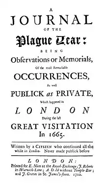 A Journal of the Plague Year: Being Observations or Memorials, Of the most Remarkable Occurrences, As well Publick as Private, which happened in London During the last Great Visitation In 1665, commonly called A Journal of the Plague Year, is a book by Daniel Defoe, first published in March 1722. It is an account of one man's experiences of the year 1665, in which the bubonic plague struck the city of London in what became known as the Great Plague of London, the last epidemic of plague in that city. The book is told somewhat chronologically, though without sections or chapter headings, and with frequent digressions and repetitions.[1]