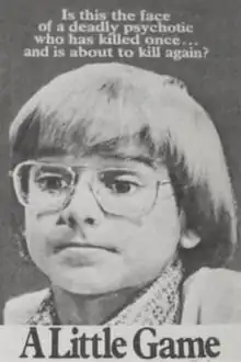 A Little Game is a 1971 ABC Movie of the Week that was first broadcast on October 30, 1971, starring Mark Gruner as a young boy who will do anything to get what he wants.[1] In the movie, the plot suggests that he might be responsible for the death of a fellow student at the military academy he attends, yet his mother (Diane Baker) refuses to believe that he could be guilty of anything. His stepfather (Ed Nelson) begins to wonder if the boy wants to get rid of him.[2] It was based on the 1968 novel of the same name by Fielden Farrington, who also wrote the screenplay. The film was directed by Paul Wendkos, who would film another of Farrington's novels for television the following year (The Strangers in 7A).[3]