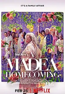 A Madea Homecoming is a 2022 American comedy film produced, written, and directed by Tyler Perry and his second film to be released by Netflix. Besides Perry, the film stars Cassi Davis-Patton, David Mann, Tamela Mann, Gabrielle Dennis, and Brendan O'Carroll. It is the twelfth film in the Madea cinematic universe which tells the story of Madea partaking in her great-grandson's college graduation party as hidden secrets emerge and surprise visitors show up. It was released on February 25, 2022. It is adapted from Perry's stage play Madea's Farewell Play, the first Madea film to be adapted from a stage play since A Madea Christmas. The film is also a crossover between the Madea franchise and the Irish sitcom Mrs. Brown's Boys.