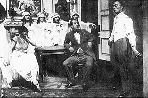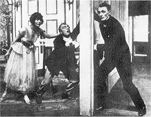 In 1896, "A Night Out", a non-musical adaptation of L'Hôtel du libre échange, opened in London and ran for 500 nights.[1] The musical adaptation, produced by George Grossmith, Jr. and Edward Laurillard followed the story of the earlier adaptation (and the French original) closely. The score was by the resident conductor of the Winter Garden Theatre, Willie Redstone, with music for additional numbers provided by the young Cole Porter as some of his earliest professional work.[2]