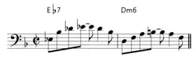 The complex ostinato bass line in the "A section" is notable for avoiding the standard walking bass pattern of straight quarter notes, and the use of oscillating half-step-up/half-step-down chord changes (using the Sub V, a tritone substitute chord for the dominant chord) gives the song a unique, mysterious feeling. The B section is notable for having an unresolved minor II-V, since the chord progression of the B section is taken from the B section of the standard "Alone Together", causing the V chord to lead back into the Sub V of the A section.
