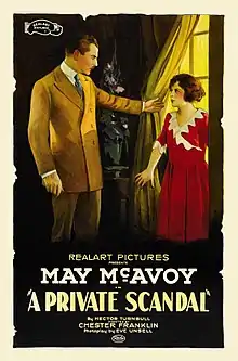 A Private Scandal is a 1921 American drama film directed by Chester M. Franklin and written by Eve Unsell. The film stars May McAvoy, Bruce Gordon, Ralph Lewis, Kathlyn Williams, Lloyd Whitlock, and Gladys Fox. The film was released on June 12, 1921, by Realart Pictures Corporation.[1][2][3]