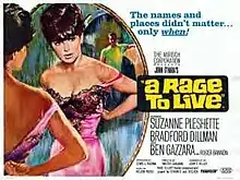 A Rage to Live is a 1965 American drama film directed by Walter Grauman and starring Suzanne Pleshette as a woman whose passions wreak havoc on her life. The screenplay by John T. Kelley is based on the 1949 novel of the same name by John O'Hara.