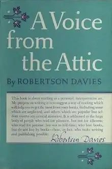 A Voice from the Attic is a collection of Robertson Davies' essays about reading aimed at intelligent and thoughtful readers, whom he calls the "clerisy". Initially published by McClelland and Stewart in 1960, A Voice from the Attic was republished during the early 1990s.