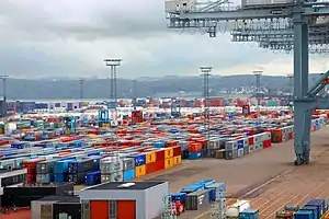 The Port of Aarhus maintains a large industrial area home to some 150 companies primarily in the transport and industry sectors which employs some 10,000 people.[19] As of 2015 it is the largest containerport in Denmark with a market share of almost 60% and the largest public bulk terminal in the country. The ferry terminal services around 1,000,000 vehicles and some 2,000,000 passengers yearly.[20]