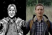 ![]() Aaron, as he appears in the comic book series (left) and as portrayed by Ross Marquand in the television series (right). | |
