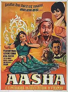 Aasha (transl. Hope) is a 1957 Indian Hindi-language romantic comedy film directed by M. V. Raman. It stars Kishore Kumar and Vyjayanthimala. The film was a critical and commercial success.[1] This film was partly coloured by both Gevacolor and Technicolor. The film was remade in Tamil as Athisaya Penn. Asha Parekh appears in the song 'Chal Chal Re Kanhai' and one scene after it with Vyjayanthimala.
