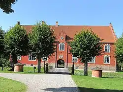 The main building is a three-winged complex. The east wing was built in 1613 by Enevold Kruse. It is constructed in red brick with crow-stepped gables and vaulted cellar. Above the gate is a sandstone plate with Enevold Kruse's and his wife Else Marsvin's names. It is unclear when the north wing was built but it is probably younger than the east wing. The west wing is from 1856. The north and west wings are also built in red brick. The entire complex was renovated in 1922-1928 by the architect V. Holck. The main building (all three wings) was listed on the Danish registry of protected buildings and structures in 1918.