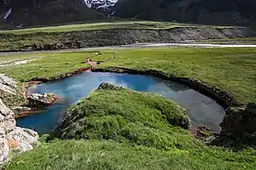 Abano Mineral Lake Natural Monument (Georgian: აბანოს მინერალური ტბა, romanized: abanos mineraluri t'ba) is a small karst lake[1] in Kazbegi Municipality in Truso valley on the left bank of Terek River, to the east of the village Abano at 2,127 m above sea level. [2]