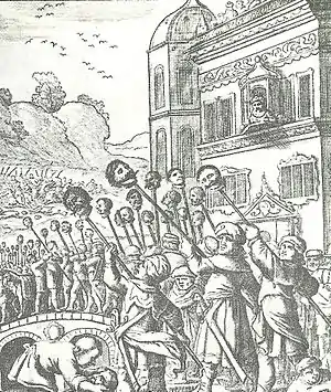 In 1599, Abbas sent his first diplomatic mission to Europe.[126] The group crossed the Caspian Sea and spent the winter in Moscow, before proceeding through Norway, Germany (where it was received by Emperor Rudolf II) to Rome where Pope Clement VIII gave the travellers a long audience. They finally arrived at the court of Philip III of Spain in 1602.[127] Although the expedition never managed to return to Iran, being shipwrecked on the journey around Africa, it marked an important new step in contacts between Iran and Europe and Europeans began to be fascinated by the Iranians and their culture – Shakespeare's 1601–02 Twelfth Night, for example, makes two references (at II.5 and III.4) to 'the Sophy', then the English term for the Shahs of Iran.[128][129] Persian fashions—such as shoes with heels, for men—were enthusiastically adopted by European aristocrats.[69] Henceforward, the number of diplomatic missions to and fro greatly increased.[130]