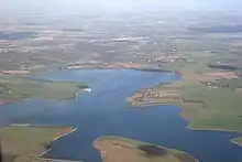 The reservoir has a current maximum area of 535 ha (1,320 acres), and has three sections separated by the Layer Breton and Layer de la Haye causeways. The easternmost large, deep Main section, originally 410 hectares (1,000 acres) was enlarged to its current 535 ha (1,320 acres) in 2013, the Central section covers 49 ha (120 acres), and the Western section is 16 ha (40 acres).[5] The current maximum water depth is about 17 m (56 ft), 3.2 m (10 ft) more than before the enlargement.[2]