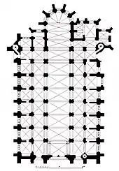The seven-bay nave is flanked by side aisles onto which open the square side chapels.