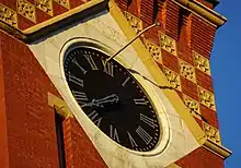 The clock in the tower of Abbot Hall is a Howard #2S installed in 1877; it is governed by a 10 ft (3.0 m) pendulum escapement, driven by an 86 lb (39 kg) weight.[2] The clangor escapement is governed by a flutter vane assembly and is powered by a 292 lb (132 kg) weight.[2] The Bell was cast by Meneely & Kimberly in Troy, New York.[5] Every week the maintenance workers ascend the tower to wind the movements. Local authors have featured the clock in numerous stories.[6] [7]