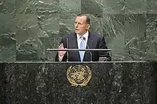 According to Defence analyst and Abbott confidant Catherine McGregor, Abbott was frustrated at the lack of a serious effort to destroy ISIS and wanted to approach the British and the French to join him in lobbying the Obama Administration to escalate its campaign against the Islamic State, and to deploy Australian Special Forces to find and kill ISIS leaders.[69] In September 2015, the Abbott government expanded Australia's military mission, by joining US-led airstrikes against IS targets in Syria, and announced that 12,000 additional refugees from the region would be accepted.[70] Shortly after losing office, Abbott gave this appraisal of the battle against Islamic State: