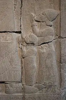 The defeated and executed king of Sidon was depicted on the Sam'al Victory stele of Esarhaddon from Zenjirli. The stele shows Abdi-Milkutti, dressed in his native costume and held with a coiled leash. Although he is shown standing with his hands raised, he reaches only to about Esarhaddon's knee. Next to him is shown a kneeling Egyptian prince.[4] He may be prince Ushankhuru, son of the Egyptian Pharaoh Taharqa with a rope tied around his neck;[1] others deem the kneeling figure to be Pharaoh Taharqa himself, as he is wearing the uraeus tiara of Egyptian rule.[5]