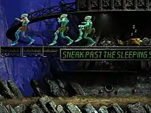 Enemies in the game primarily consist of Sligs, semi-robotic creatures who will attempt to kill the player character on sight. Although most have mechanical legs and carry machine guns, some Sligs wear helicopter flight packs and launch grenades. Some Sligs choose to sleep without wearing mechanical legs, in which case they are vulnerable until they can obtain a set. Sligs can be possessed by the player character, who can then control the Slig and utilize its weapon. Sligs cannot see in dark shadows, which create natural hiding places for the player character. Sligs are often accompanied by Slogs, bipedal doglike creatures that chase and attack the player character on sight. Slogs can be commanded if the player possesses a Slig, and can be ordered to attack and kill enemies. Sloggies are the puppy form of Slogs, and are slower but just as deadly if the player character encounters them. Slogs and Sloggies can be distracted with bones.