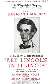 The play premiered on Broadway on October 15, 1938, at the Plymouth Theatre and closed in December 1939 after 472 performances. Directed by Elmer Rice, it starred Raymond Massey as Lincoln, Muriel Kirkland (Mary Todd), Adele Longmire (Ann Rutledge), and Albert Phillips (Stephen A. Douglas).[1] It subsequently transferred to the Grand Opera House in Chicago where it ran for 12 weeks from January 8 through March 30, 1940.[2] Massey's role in the play came about as the result of a promise he had made to Sherwood six years previously to "be there when he needed me".[3] It was the first production of the newly established Playwrights' Company.[4]