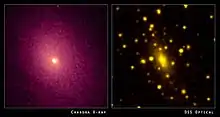 Abell 2029 or A2029 is a large and relaxed cluster of galaxies 315 megaparsecs (1.027 billion light-years) away in the constellation Virgo.[5] A2029 is a Bautz–Morgan classification type I cluster due to its large central galaxy, IC 1101. Abell 2029 has a diameter of 5.8–8 million light-years. This type of galaxy is called a cD-type brightest cluster galaxy and may have grown to its large size by accreting nearby galaxies. Despite its relaxed state, it is the central member of a large supercluster which shows clear signs of interaction.