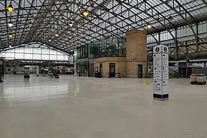 As of early 2019, the station's glass roof is undergoing replacement with polycarbonate panels as part of a £9 million upgrade.[16] In June 2020, ScotRail announced that it would proceed with the modifications to the ticket office, waiting room, and taxi rank as soon as it was safe to do so following the coronavirus pandemic. There are no plans to reinstate the platforms yet.[17] These developments completed by the end of 2021.[18]