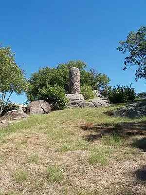 The Abigail Adams Cairn marks the spot where Abigail Adams and her young son, John Quincy Adams, watched the burning of Charlestown on Saturday, June 17, 1775, during the Battle of Bunker Hill. It is located on Penn's Hill, now at the corner of Franklin Street and Viden Road in Quincy, Massachusetts. Abigail was caring for the four children of Dr. Joseph Warren, then President of the Massachusetts Provincial Congress, as well as her own children, Nabby (age 10), John Quincy (7), Charles (5), and Thomas Boylston (3), when word came that Dr. Warren had been killed by British troops. In the afternoon, she walked up Penn's Hill to the rock outcroppings, taking her son John Quincy and Nabby along with her. There they looked out over the distant hills and shoreline, seeing the smoke of Charlestown and hearing the far-off rumble of guns and cannon at Bunker Hill.