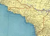 The Georgian territories were initially organised into the Georgia Governorate, then later split off as the Georgia-Imeretia Governorate from 1840–46, and finally divided into the governorates of Tiflis and Kutaisi. The northern border of these territories roughly corresponds with the modern Georgia-Russia border i.e. running along the Caucasus Mountain range. Abkhazia was formed as semi-autonomous region in 1810, with a border with Georgia set along the river Ghalizga.[4] In 1864 Abkhazia was re-designated as the 'Sukhum Military District' (from 1883 Sukhum Okrug, within Kutaisi Governorate), incorporating the Samurzakano region west of the Ingur river which had hitherto been part of Kutais governorate and had been disputed between the rulers of Abkhazia and Mingrelia.[5] Over the following decades the ethnic makeup of Abkhazia changed due to influxes of Georgian and Russian settlers.[6]
