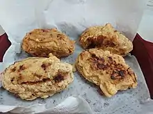 Aborrajados de plátano maduro (also called Aborrajados colombianos) is a dish of deep fried plantains stuffed with cheese in Colombian cuisine. Abborrajado (called albardilla in Castilian Spanish) refers to an egg and flour batter used to fry certain foods in a manner similar to fritters.[1][2] In general, aborrajado means a dish of cheese-filled plantains dipped in batter and deep-fried (giving it its name, which means "battered"), but the term can be used for other variations of the dish like Aborrajado con Chicharrón, which includes chicharrón (fried pork belly), in addition to the basic recipe of plantains and cheese.[3] Guava paste, known as bocadillo in Colombia, is also sometimes included as part of the filling.[4]