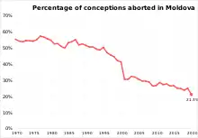 The abortion rate in Moldova has declined sharply since independence. In 1989, the Moldavian Soviet Socialist Republic reported a rate of 93.0 abortions per 1,000 women aged 15 to 44 years, which was among the highest reported rates in the Soviet Union; the actual rate was much higher. The abortion rate fell to 50 in 1994, 38.8 in 1996, 30.8 in 1998[2] and 17.6 in 2004.[3] As of 2010, the abortion rate was 18.0 abortions per 1,000 women aged 15-44 years.[4]