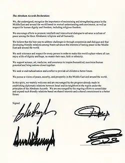 - "The Abraham Accords Declaration". State.gov. U.S. State Department. 2020-09-15. Archived from the original on 2020-09-20. Retrieved 2022-09-04.