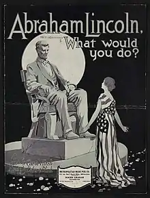 Although Abraham Lincoln's death was well before the beginning of the twentieth century, he was often used symbolically, particularly during World War I.[4] "Abraham Lincoln, what would you do?" was a popular composition upon its release,[5][6] and Lincoln's image was used in the composition's lyrics to promote and build support for American involvement during wartime.[7] Sociologist Barry Schwartz suggests that the lyrics represented American involvement in the war in terms of a collective debt to be paid to Lincoln's contributions and legacy, specifically in the line: "Abraham Lincoln, we owe it to you, to protect this great country today".[3] This idea of indebtedness is also reflected in the illustration on the cover of the sheet music; Schwartz comments that the United States is portrayed as Columbia, a woman draped in the American Flag with open arms looking up to Lincoln's statue and seeking to follow his example.[8]