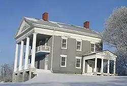 Abraham Wagener House is a historic house located at Jerusalem in Yates County, New York. This Greek Revival style structure was built about 1833 and features a monumental proportioned temple portico with full pediment and wide entablature supported by massive two-story columns.[2]