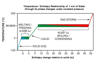 - H2Ospecific heat capacity, Cp = 0.075327 kJ⋅mol−1⋅K−1 (25 °C); Enthalpy of fusion = 6.0095 kJ/mol (0 °C, 101.325 kPa); Enthalpy of vaporization (liquid) = 40.657 kJ/mol (100 °C). Citation: Water Structure and Science, Water Properties (by London South Bank University). Link to Web site.