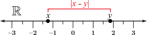 The absolute difference of two real numbers and is given by , the absolute value of their difference. It describes the distance on the real line between the points corresponding to and . It is a special case of the Lp distance for all and is the standard metric used for both the set of rational numbers and their completion, the set of real numbers .