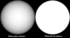 A full-phase diffuse sphere reflects two-thirds as much light as a diffuse flat disk of the same diameter. A quarter phase () has as much light as full phase ().
