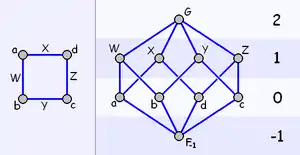 Smaller posets, and polytopes in particular, are often best visualized in a Hasse diagram, as shown. By convention, faces of equal rank are placed on the same vertical level. Each "line" between faces, say F, G, indicates an ordering relation < such that F < G where F is below G in the diagram.