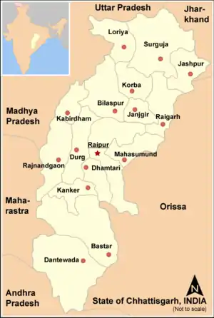 The dense forests of Abujmarh have long been isolated from the outside world, inhabited largely the indigenous people, and accessible only via forest pathways starting from Narayanpur, Bijapur and Basroor. Geographically, the Indravati river segregates it from Bastar region, adding to its isolation.[5][6] Recently the access to area has been further marred by heavy use of landmines by the insurgents at entry points.[7] During the British rule in India, Abujmarh remained in isolation and constitutionally "excluded",[8] though a land survey was done in 1873.[9] After independence of India, its isolation continued, except when in 1958 the government refugees from East Bengal in the Dandakaranya area in the present Bastar division, and later the hills started getting exploited for its mineral wealth, like the Bailadila Hills excavated for its deposits of high-grade iron ore.[8] The tribals remained backward and exploited by prevalent feudalism in India,[8] majority of them started cultivation only recently, and education was undertaken only at small schools run either by NGOs and missionaries.[9] All these conditions, after 1967 gave rise to the Naxalite movement, which grew and spread over the coming decades.[8]