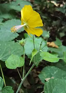 Abutilon persicum is a large erect shrub, growing up to 1–2 m high.[1] The stem yields a long and silky fibre which can be used to make rope.[2] It prefers moist deciduous and semi-evergreen forests.