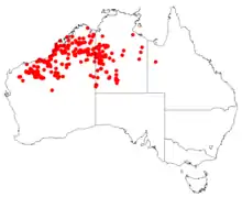 It occurs on red sand soils, ironstone gravel, and stony plains. In Western Australia it is found in the Central Kimberley, Dampierland, Gascoyne, Great Sandy Desert, Little Sandy Desert, Northern Kimberley, Ord Victoria Plain, Pilbara and Tanami IBRA bioregions.[1] It is also found in the central western parts of the Northern Territory.[2]