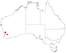It is native to a small area in the Wheatbelt region of Western Australia where it is commonly situated on hillslopes growing in gravelly lateritic soils.[1] The limited range is around New Norcia as a part of heathland or open Eucalyptus wandoo woodland or Corymbia calophylla woodland communities.[2]