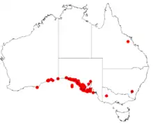 It is native to an area along the south coast of the Goldfields-Esperance region of Western Australia[2] and coastal areas of South Australia as far east as the Eyre Peninsula.[3] It grows well in calcareous sandy soils and shallow red-brown sandy soils as a part of coastal dune vegetation or open scrub ecosystems.[3]